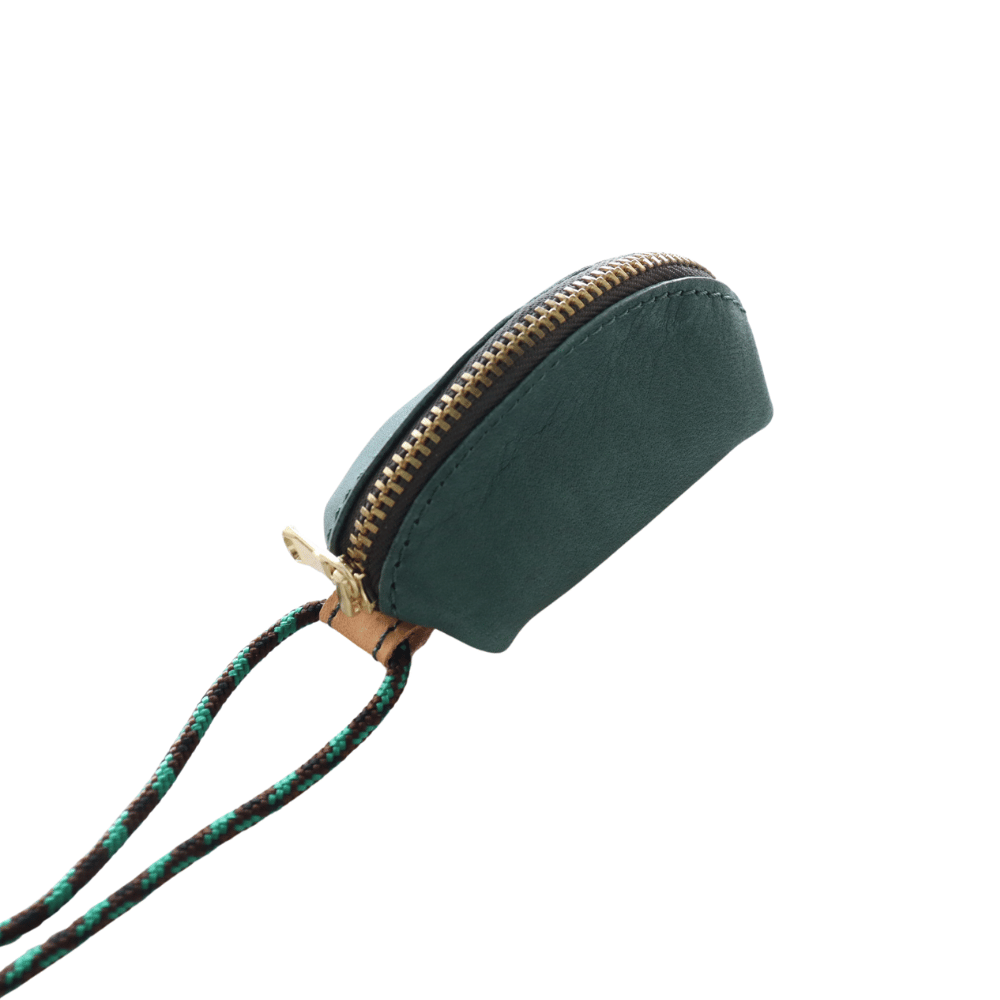ファスナーサイドのヌメ革のループに、丸紐を通して首からぶら下げることができます。