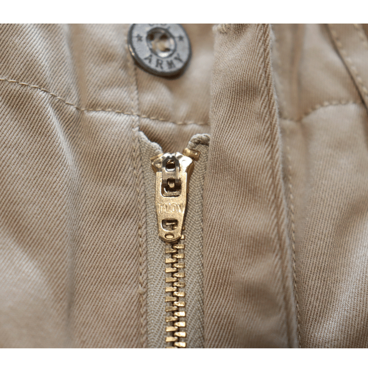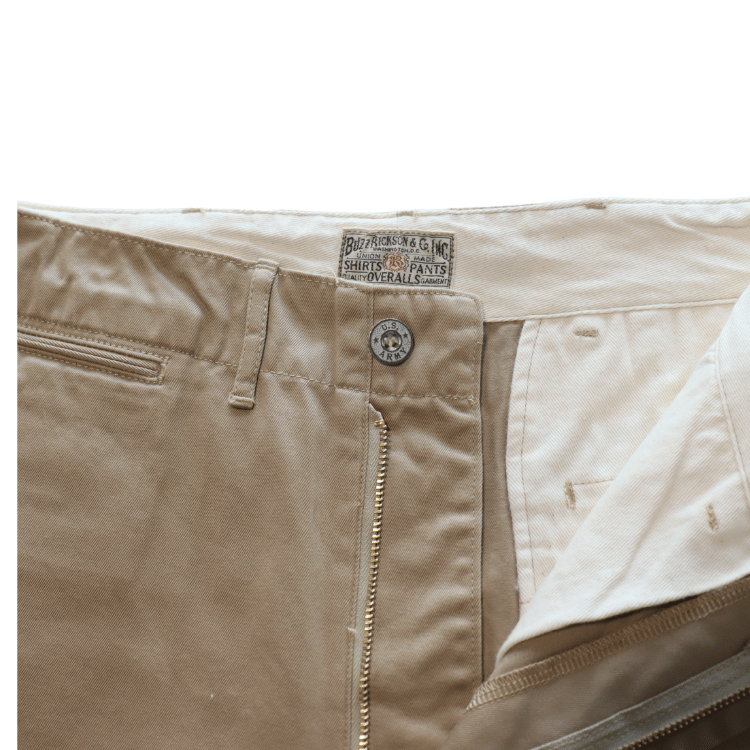 チノパンといえば割り縫い仕様で斜めポケットのこのスタイルが一般的であるが、フロントにメタルボタン(U.S. ARMYの刻印入り)を使用し、ポケット口が両玉縁仕様になっているものはヴィンテージでも希少。