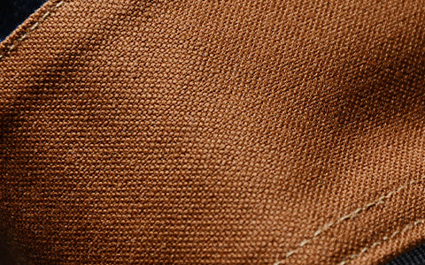 当時の製作工程になぞり、先染めを行い旧式力織機で織り上げることで、ヴィンテージさながらの生地の凹凸感・質感に仕上げたダック生地を使用しております。