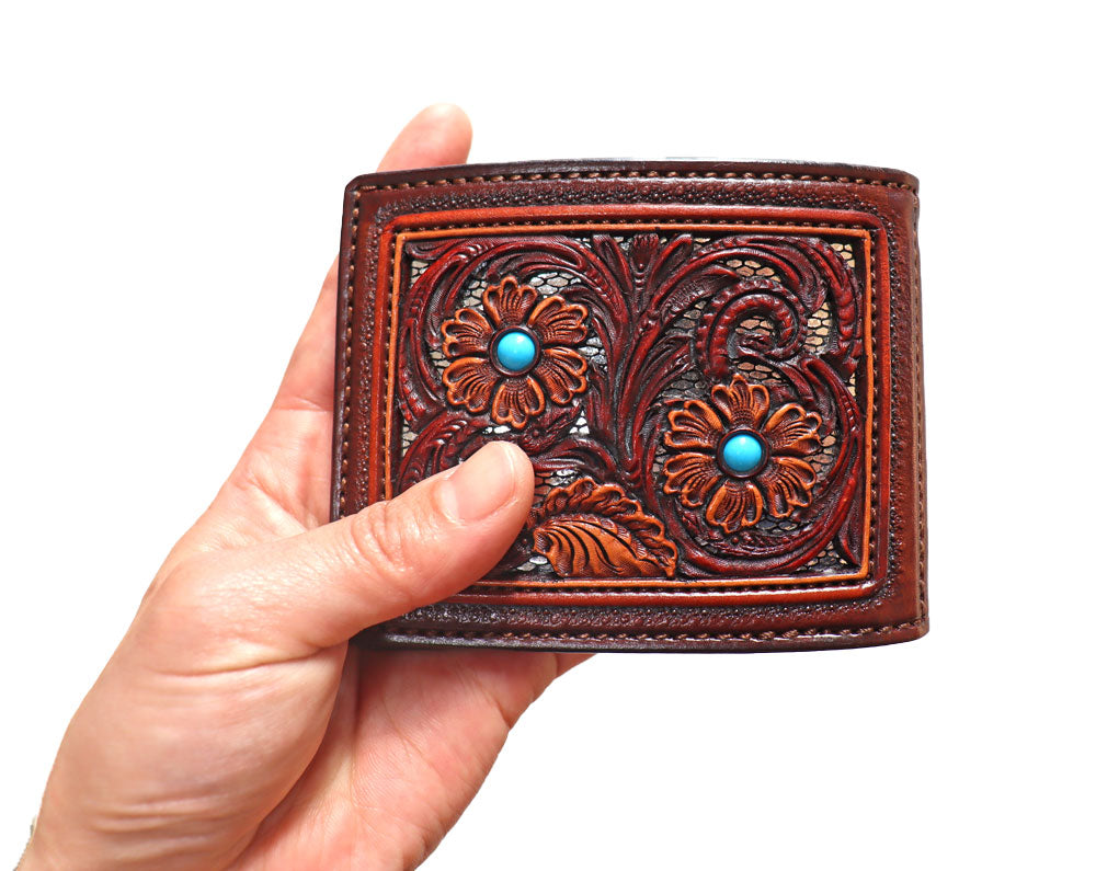 さらに、仕上がったクラフトの花柄の中央2ケ所にターコイズを埋込み、