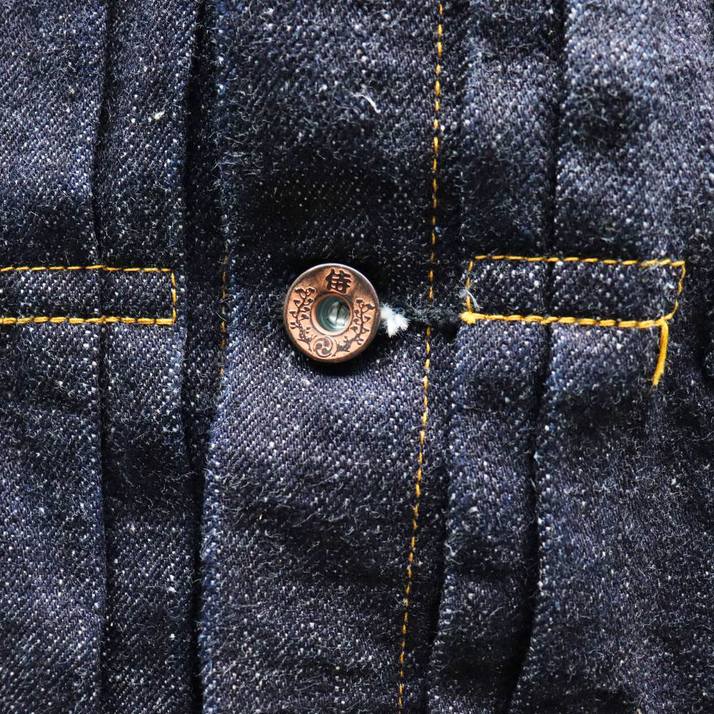 染めは、これまでのサムライオリジナルデニムの中で、最も濃色のインディゴに染め上げ、黒味が強く深い色になっています。
