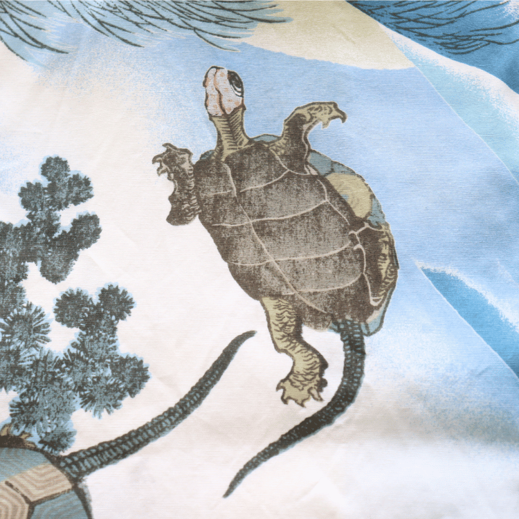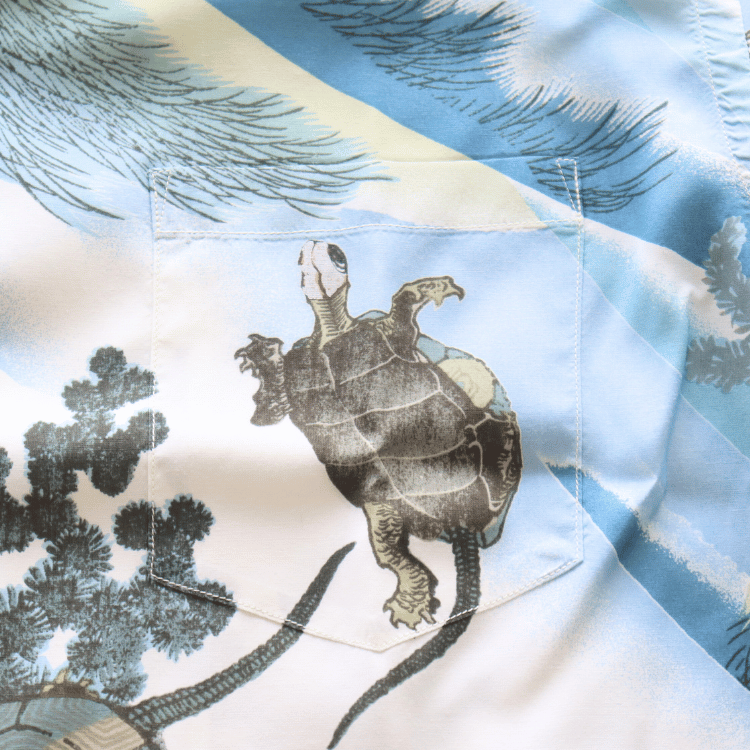また当時、亀の頭の部分には銀が使われていたが、シャツ用としては適さないため実物の色合いに近い銀色の顔料を使用している。