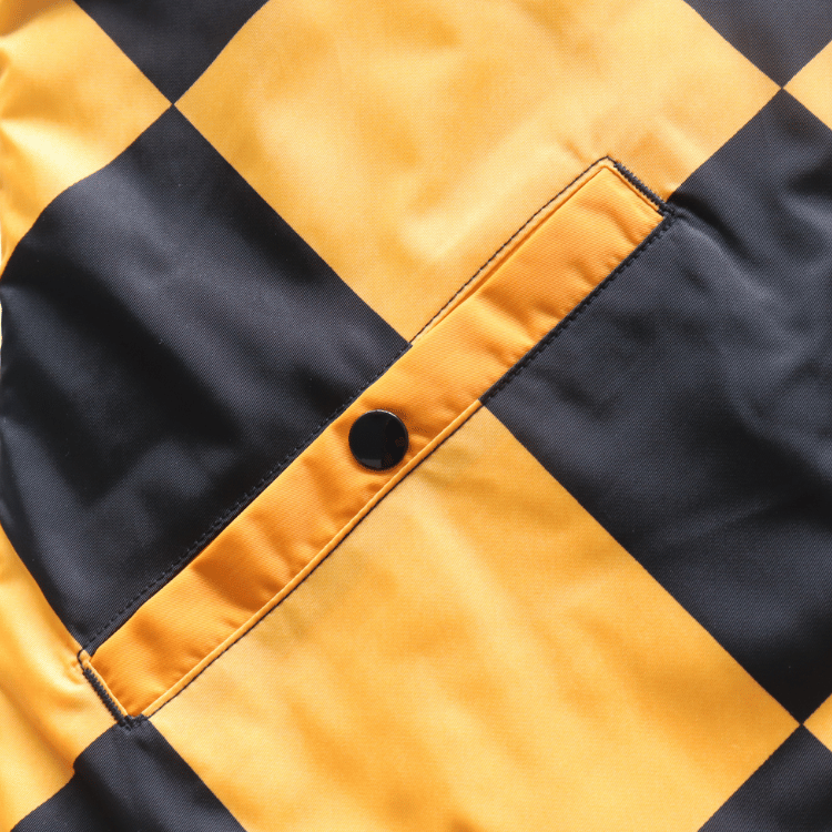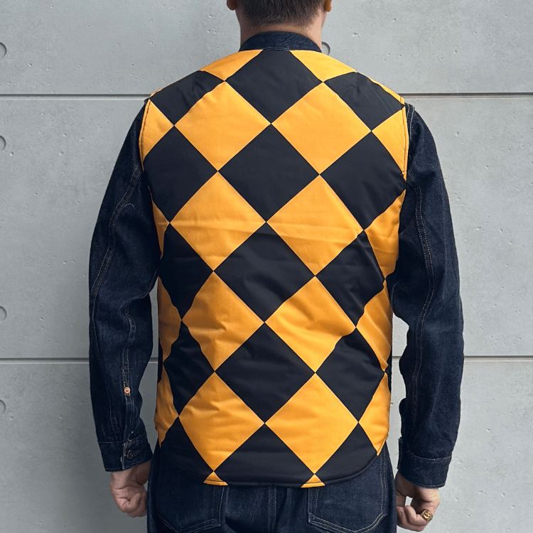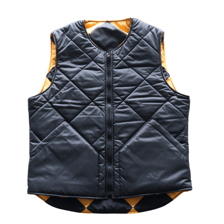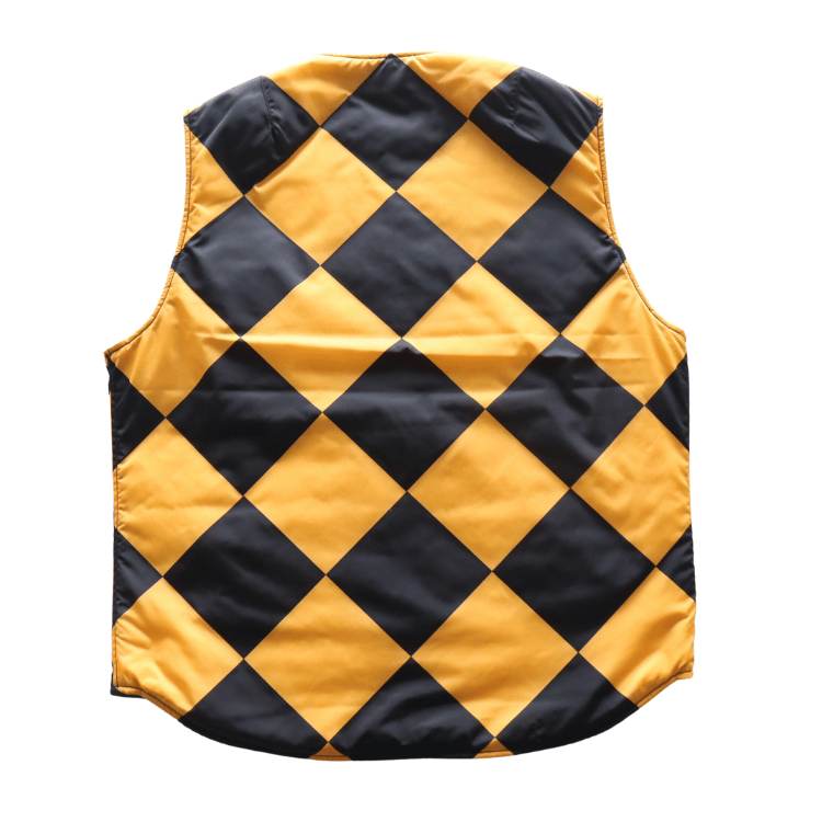 ユーティリティージャケットと同様のアークイエロー×ブラックのチェック柄に加え、ブラック単色のナイロンでリバーシブル仕様としたベスト。