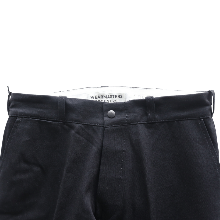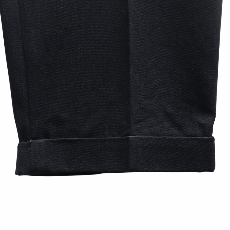 ダブルヘム / ヘリンボーンスレーキ / ダールブラックのメタルボタンを採用したボタンフライを備える。
